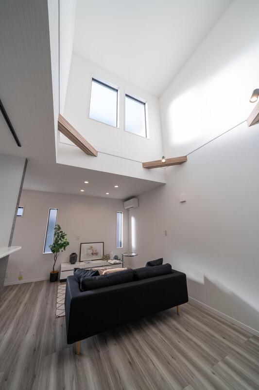 吹抜けを施した開放的なLDK。上部の窓からたっぷりと光が差し込み、心地よい空間になるよう設計しています。