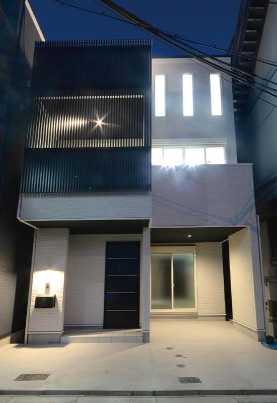 ほどよい目隠しとなる黒いルーバーがアクセントの建物外観。向かって左側の建物上部に屋上を設けました。《分譲地外:建物面積91.12m2、建物価格1674万円》