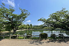 公園の真ん中の噴水がシンボルの緑豊かな水月公園。1年中様々な花や植物が楽しめ、子供たちの遊べる遊具エリアや散歩道もあり、人気の公園が徒歩7分の距離に。