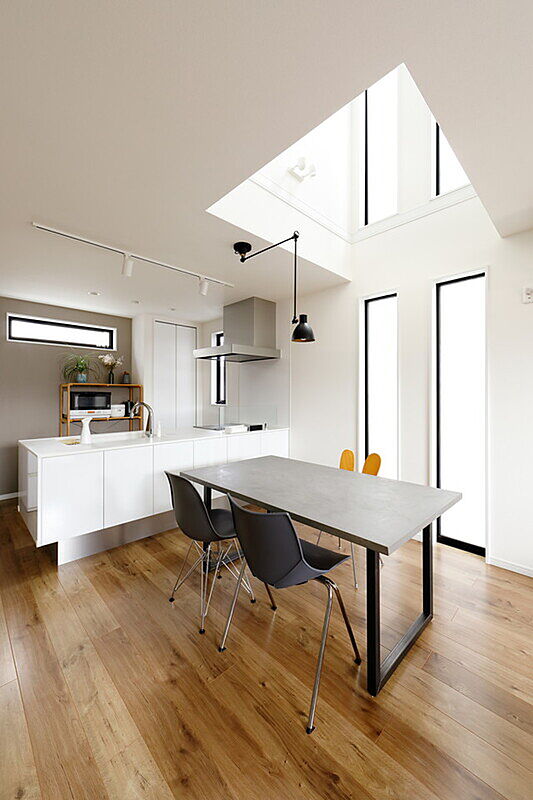 玄関とキッチンを吹抜でつなげることで、家族が帰ってきた気配を感じることができ、玄関から最短距離で洗面室とつなげて、すぐに手洗いが可能に。キッチン横にダイニングをつなげ家事動線をコンパクトにし、料理しながらリビングで過ごす家族と目線が合うようにリビングを1段上げるなど、随所に「つながる」を意識して設計。