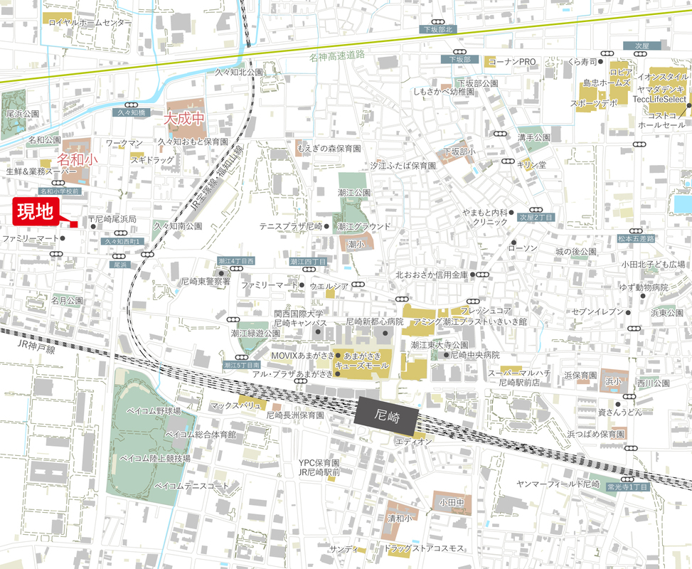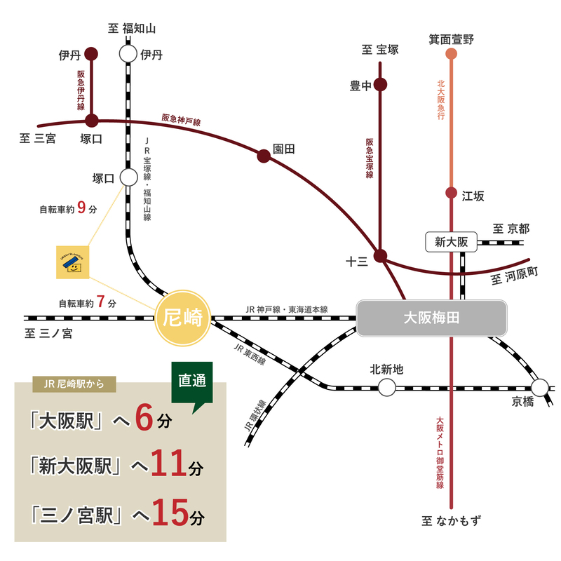 ■JR東海道本線の「尼崎駅」へ徒歩19分。自転車を使えば約7分の近さ!大阪方面、神戸方面、宝塚方面へのアクセスが非常に便利に。駅まではフラットな道のりも嬉しいポイント!