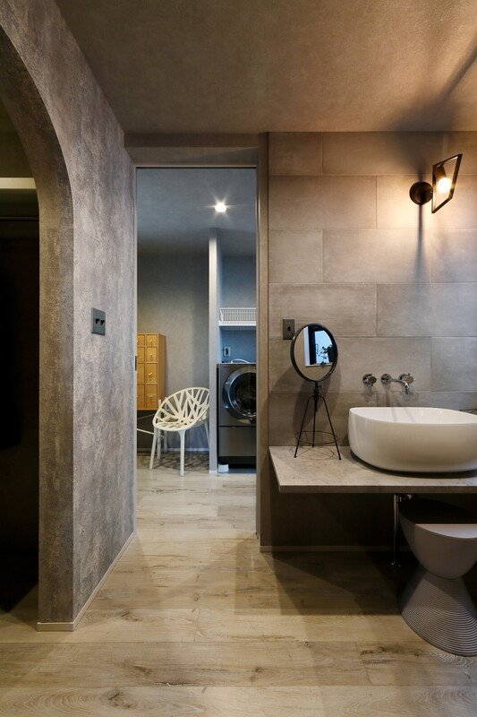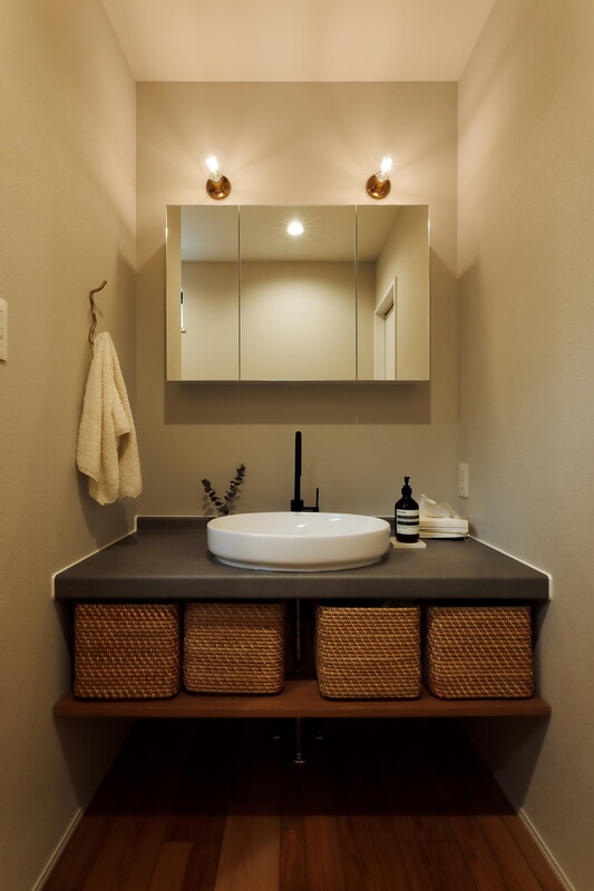 2階の洗面スペースはインテリアと調和するグレー×木のデザインに...