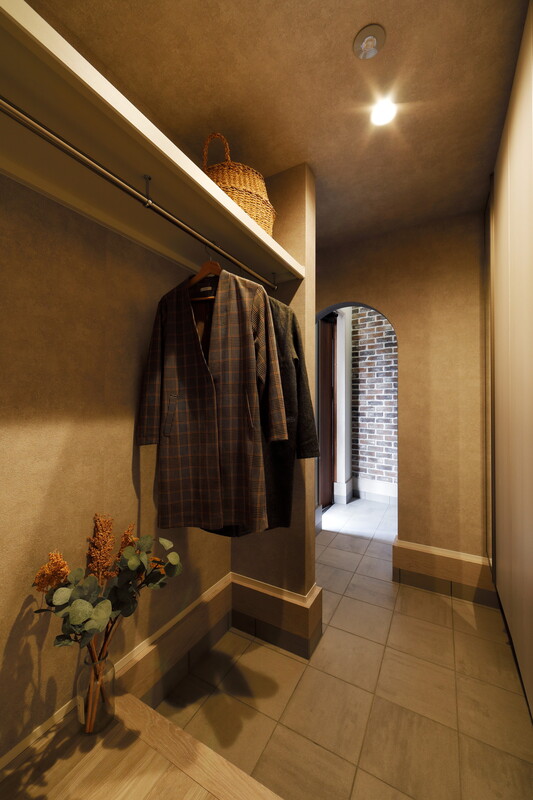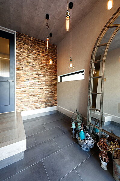 その家の顔となる玄関は、ゆとりのある広さを確保し、スポット照明...