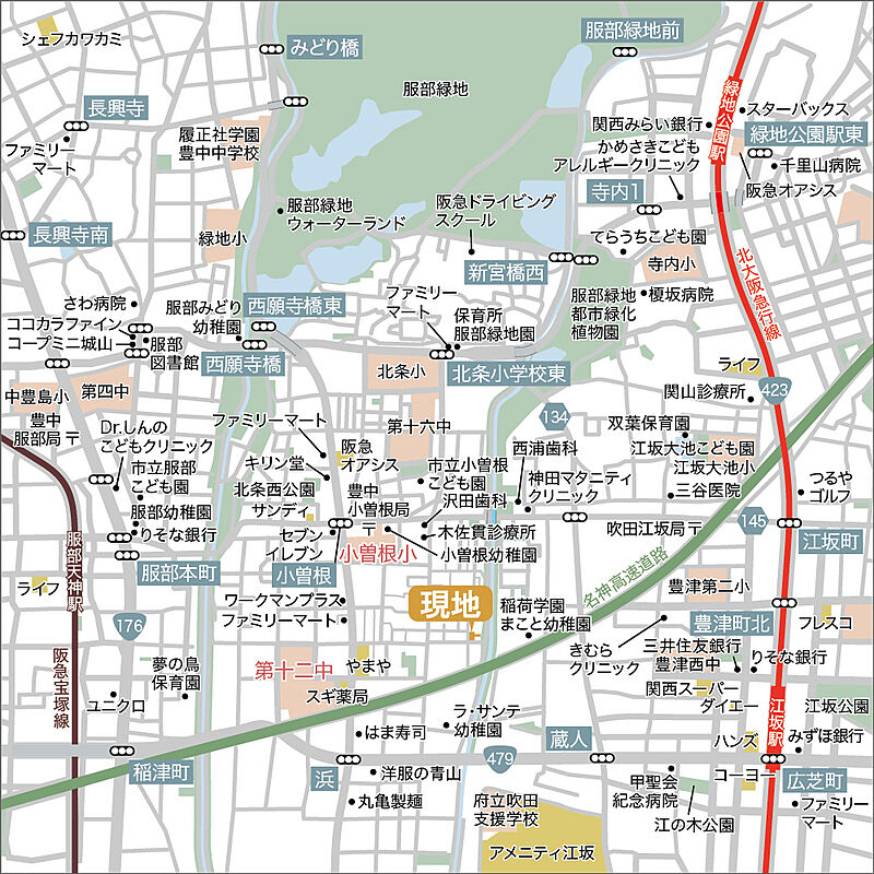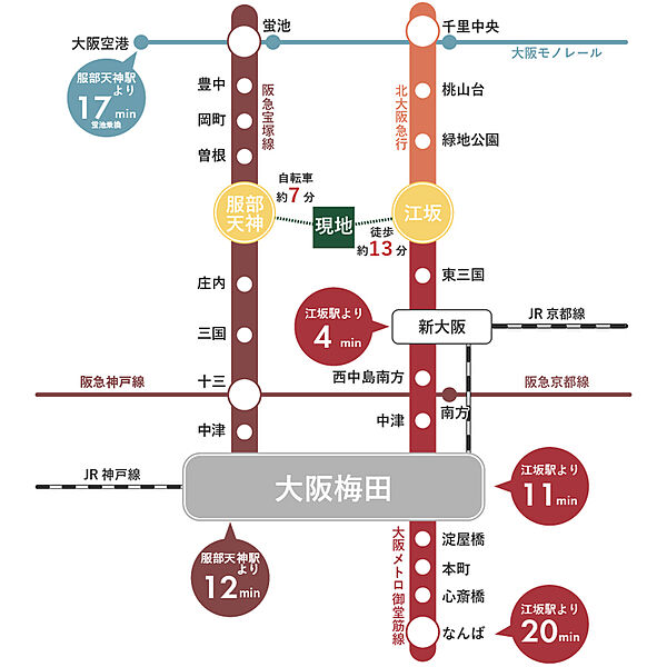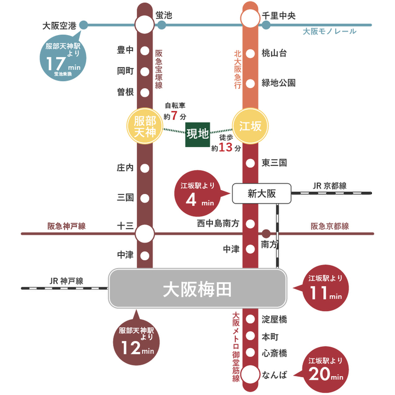Osaka Metro御堂筋線「江坂」駅 徒歩13分 阪急宝塚本線「服部天神」駅 徒歩18分 |