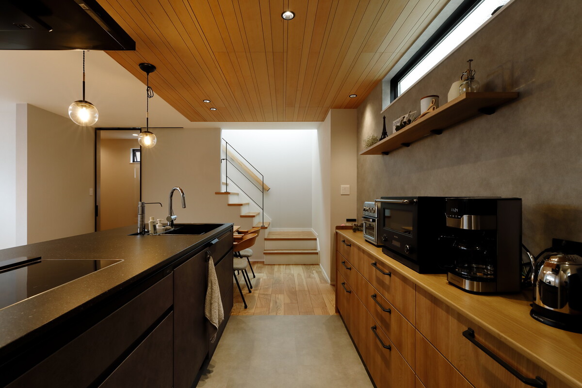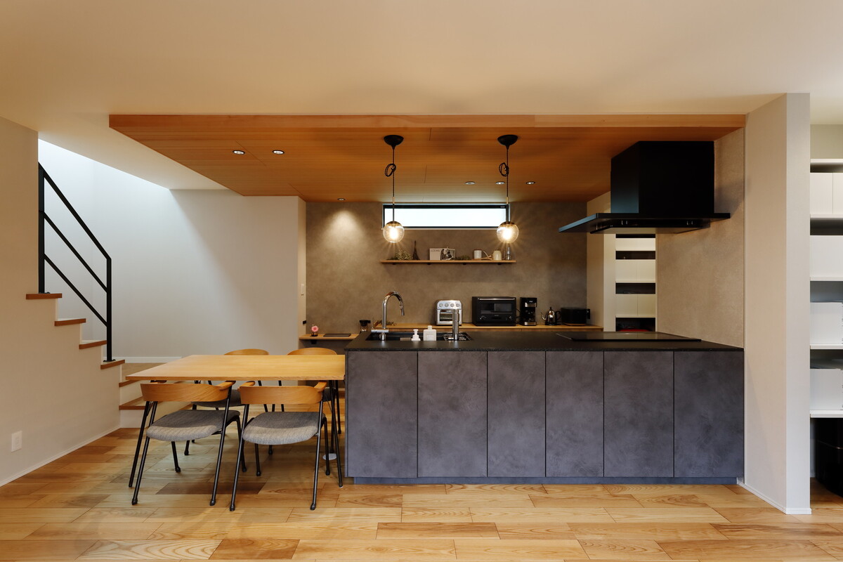 高級感のあるキッチンの黒い天板と扉に、天井の木目や壁のグレイッ...