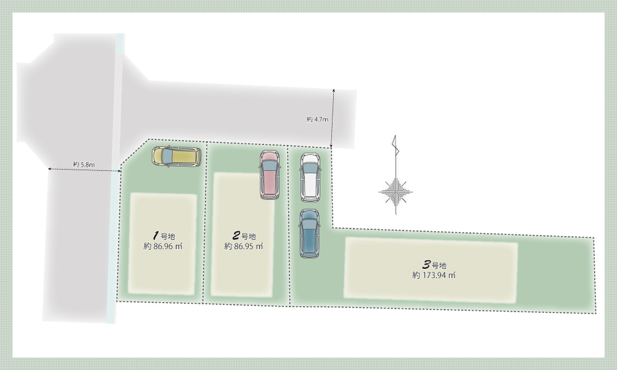 | 駐車場 | - | 道路の幅員 | 北側公道約4.7m、西側公道約5.8m、私道負担なし |