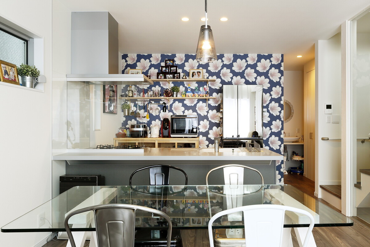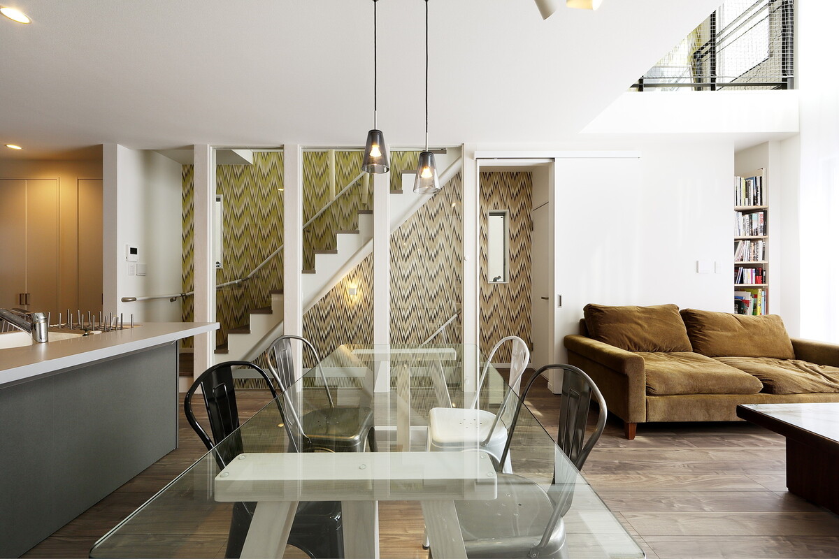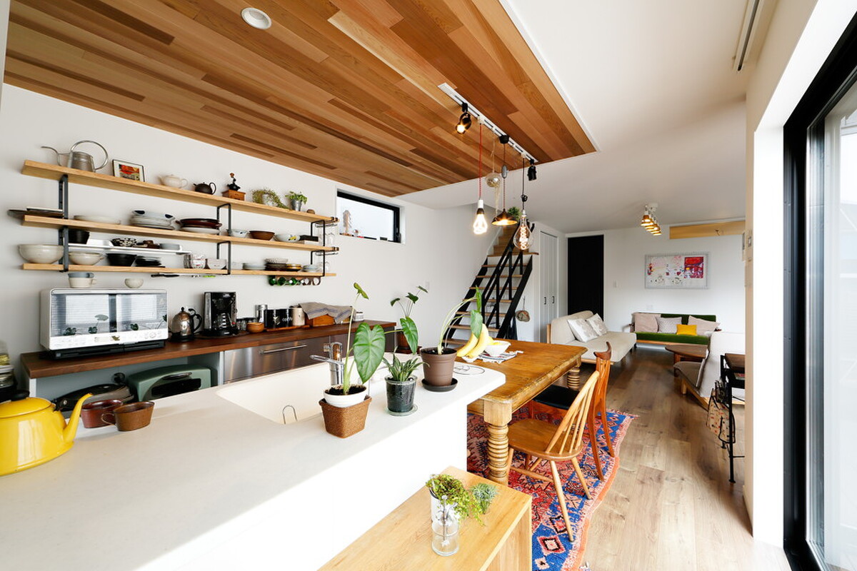 キッチンに立つママと、リビングで過ごす家族の目線があうように、段差を設けたり、LDKと居室で過ごす家族とつながるように、吹抜け&パーテーションにするなど工夫がいっぱい!