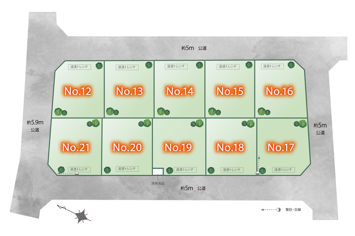 - 土地面積は全区画で約120m2・約36坪以上。区画の整った大型開発分譲地内です。