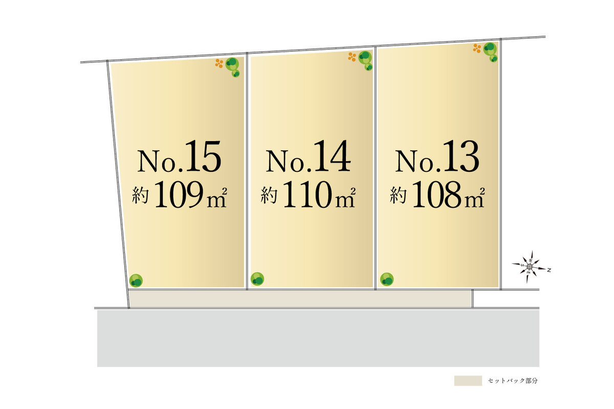 ※景観条例、22条23条区域、農地法 ※都市再生特別措置法(居住誘導区域内)、都市機能誘導区域外 ※宅地造成及び特定盛土等規制法、宅地造成等工事規制区域 ※セットバック持分/No.13:約6m2、No.14:約8m2、No.15:約7m2有 ※土地面積にはセットバック部分(No.13:約6m2、No.14:約8m2、No.15:約7m2)が含まれています。 ※未利用地持分:6.52m2×各1/15 |