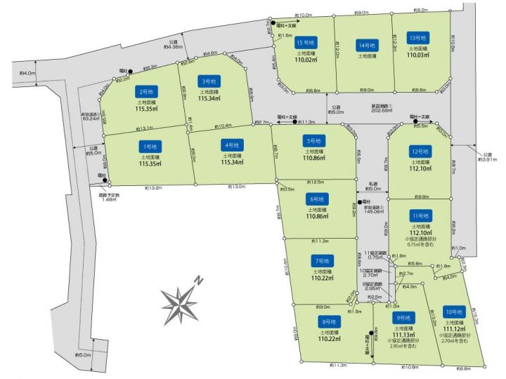 【接道】北4.36m公道、東3.91m公道、新設道路(1)、(2)5.0m公道、新設道路(3)5.0m私道 【設備】公営水道、都市ガス、本下水 【交通】武蔵野線「新秋津」駅まで自転車7分(約1,360m)、西武池袋・豊島線,西武鉄道新宿線「所沢」駅まで自転車8分(約1,680m) 【協定道路】敷地面積に含む 9号地:2.95m2、10号地:2.70m2、11号地:0.75m2 【その他法令】第一種高度地区、準防火地域、景観法、文化財保護法、航空法 |