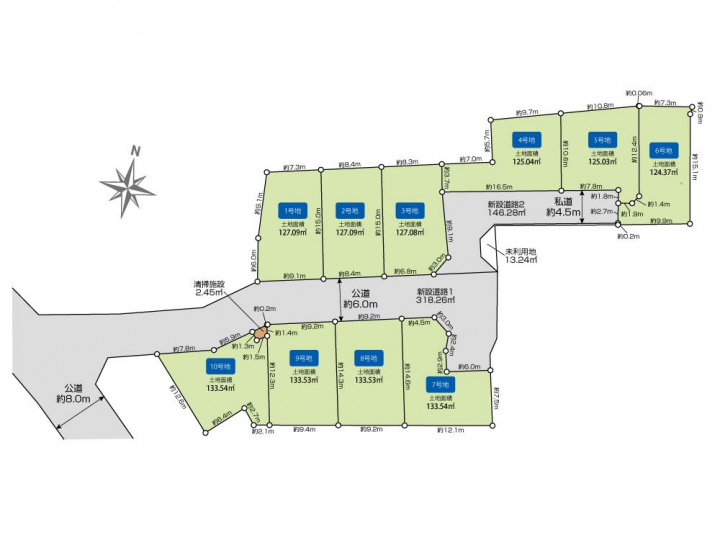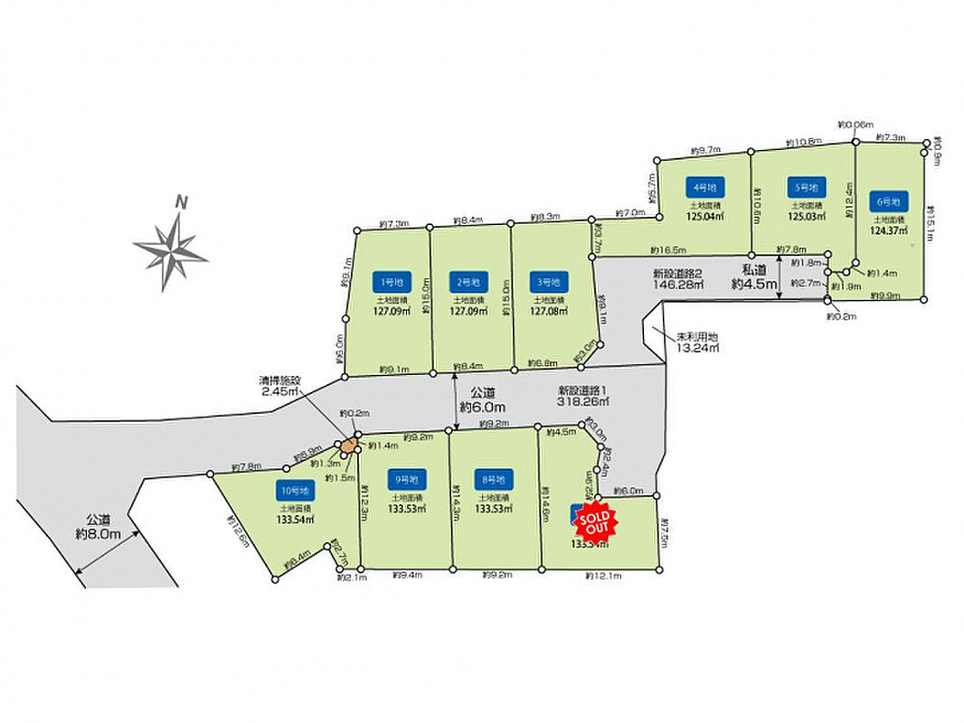 | 駐車場 | 0台 | 道路の幅員 | 西8.0m公道、新設道路(1)6.0m公道、新設道路(2)4.5m私道 |