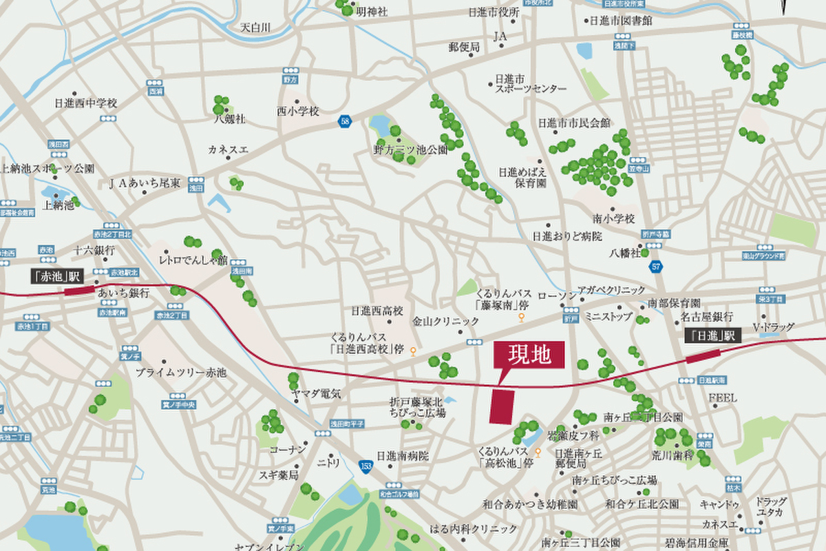 - 名鉄豊田線「日進」駅 徒歩16分名鉄豊田線「赤池」駅 くるりんバス「高松池」停より乗車16分名古屋市営鶴舞線「赤池」駅 くるりんバス「高松池」停より乗車16分