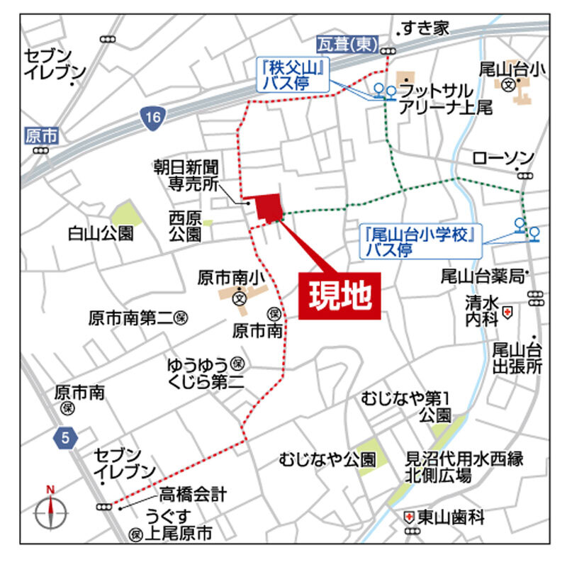 JR東北本線「東大宮」駅 東武バス又は朝日バスで16~18分。「秩父山」バス停 徒歩5分~6分 JR東北本線「東大宮」駅 徒歩23分 埼玉新都市交通「吉野原」駅 徒歩19分 |