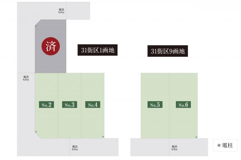 全6区画。公道6Mに囲まれた整形地。道路との高低差は少なく南接...