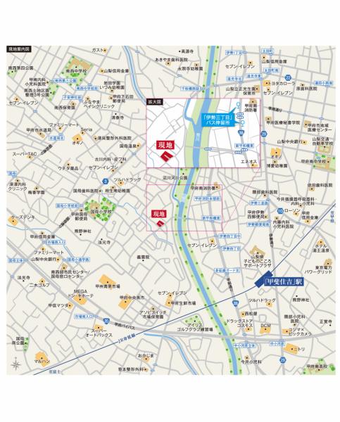 JR身延線「甲斐住吉」駅まで徒歩15~16分。幼稚園・保育園・小学校・スーパー・ドラッグストア・コンビニが徒歩10分圏内に充実!利便性の高い立地で、毎日の暮らしに理想的な環境が広がっています。