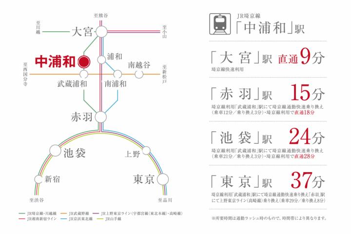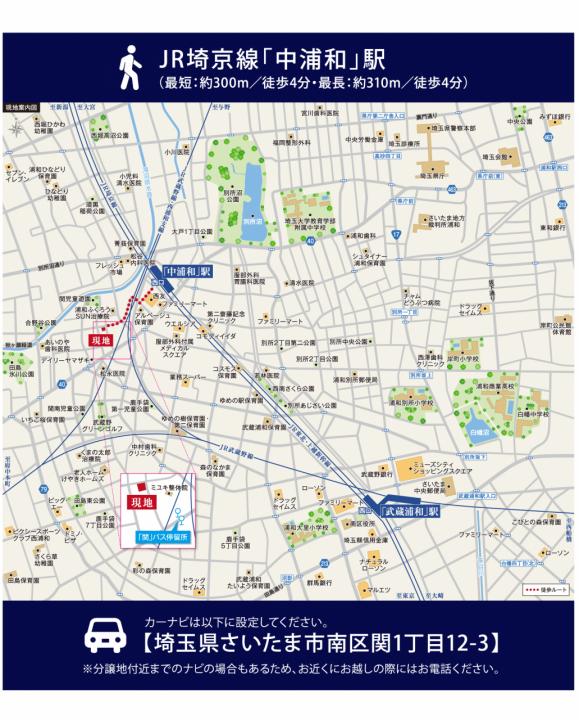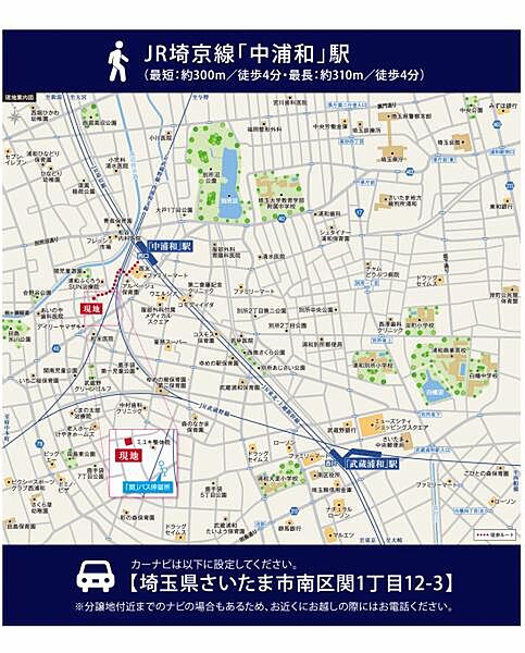 JR埼京線「中浦和」駅 徒歩4分 JR武蔵野線「西浦和」駅 徒歩17分 JR埼京線「武蔵浦和」駅 徒歩18分 |