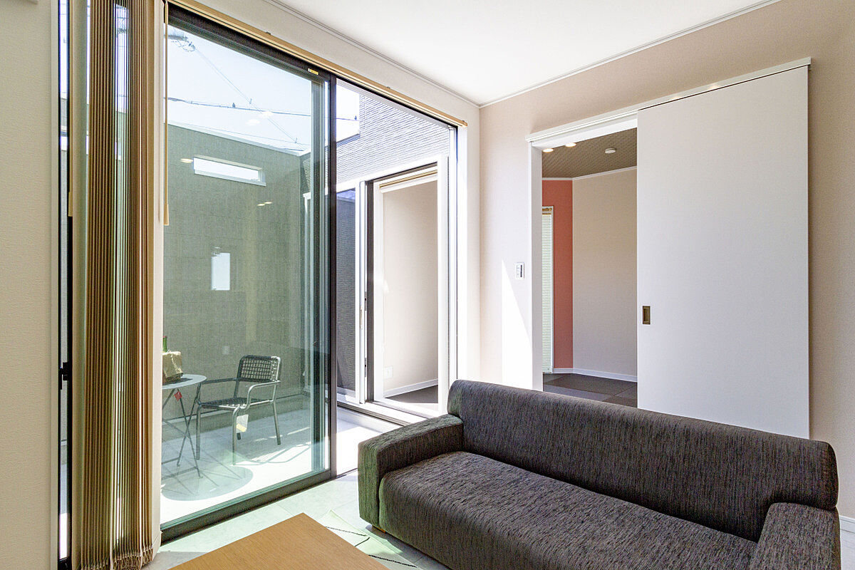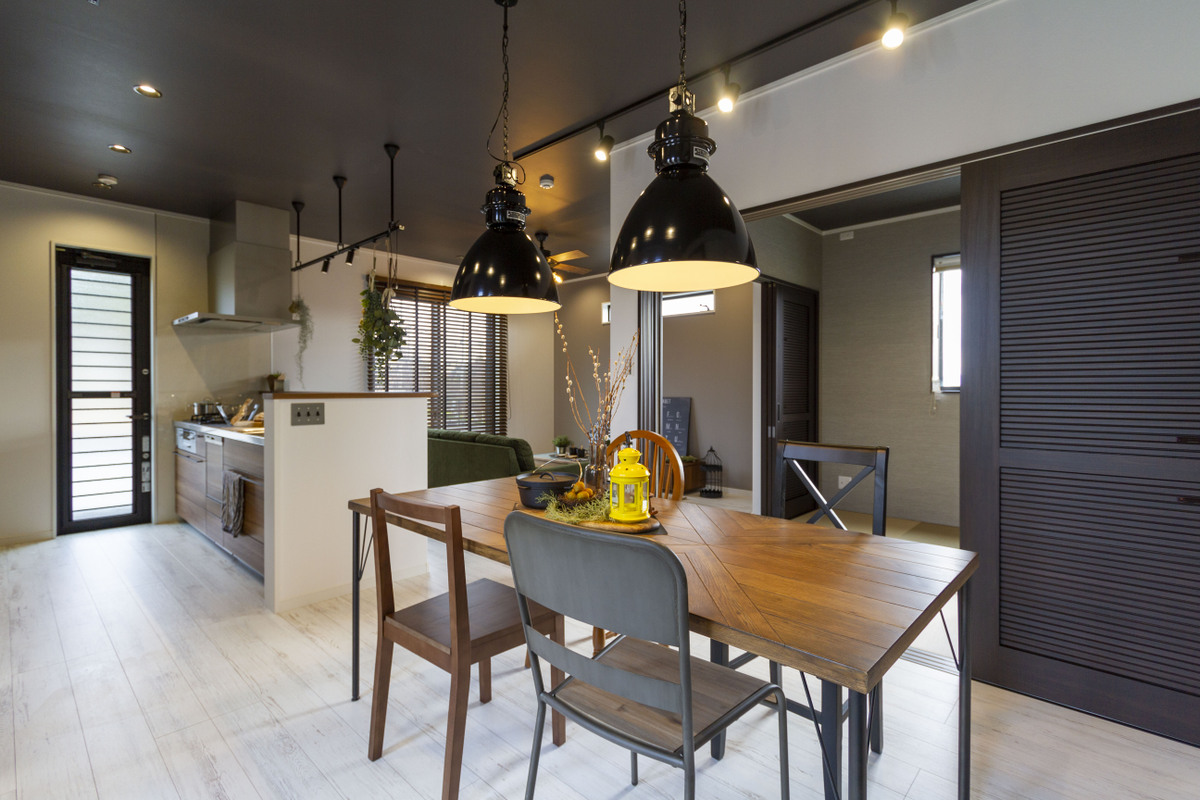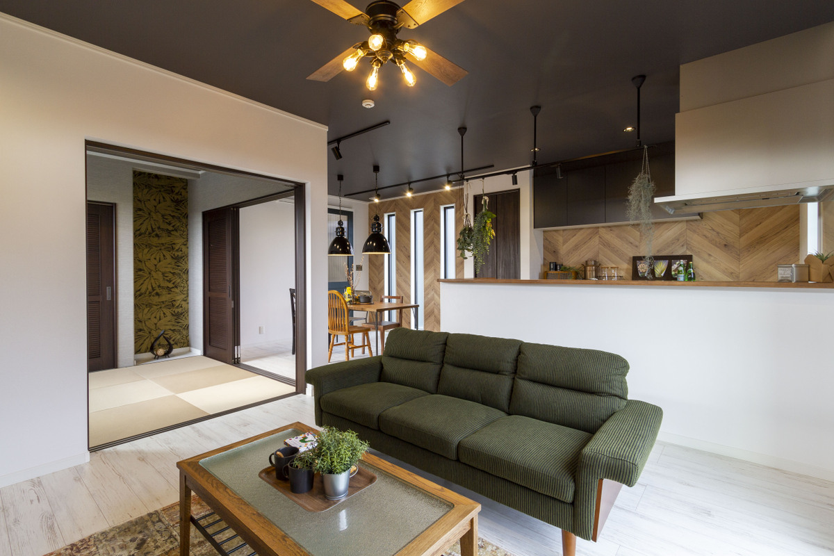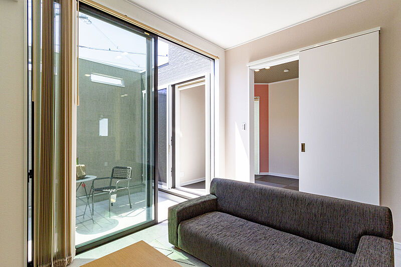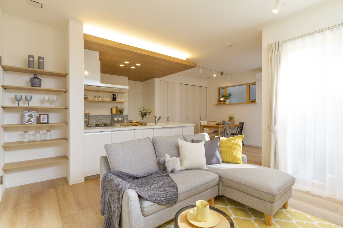 ウッドデッキに繋がる掃き出し窓から明るい光が入るLDKです。昼間は明るい自然光、夜は温かみのある照明がお部屋を包み、快適にお過ごしいただけます。
