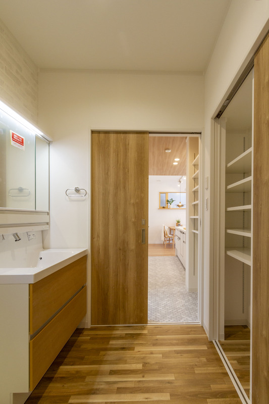 キッチンと玄関ホールから出入りができる2WAYアクセス可能な洗面室です。帰宅時の手洗いもスムーズに行えます。大容量のリネン庫を備えており、洗剤やタオルなどもスッキリ収納可能です。