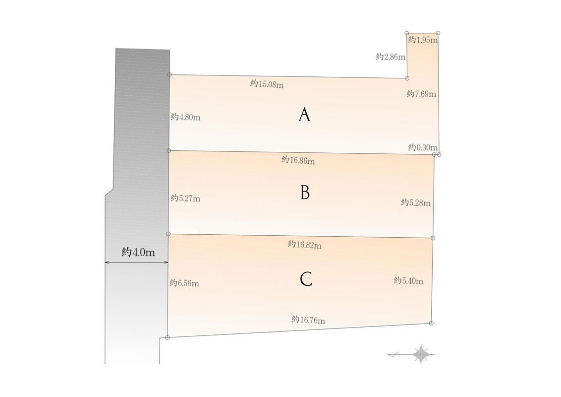 | 駐車場 | - | 道路の幅員 | 北側約3.4m~約4.0m私道(SB後) 別途私道負担面積 SB部分 A区画 2.59m2 他 |