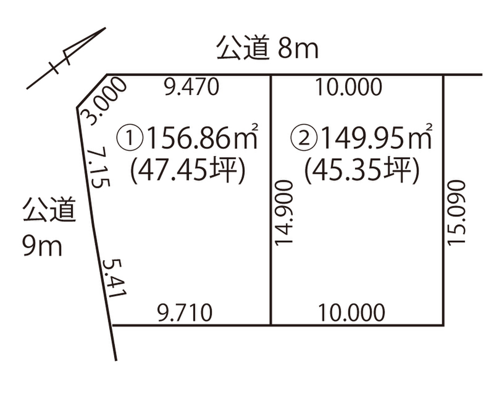 | 駐車場 | - | 道路の幅員 | 北西側8m公道、南西側9m公道 |