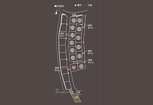 | 主たる設備の概要 | 電気:中国電力 ガス:都市ガス(岡山ガス) 水道:岡山市上水道(公営) 汚水・雑排水:岡山市下水道(公営) 雨水:道路可変側溝 | 開発許可番号 | 完成済(11号地、12号地、13号地、14号地、15号地、16号地、18号地、19号地、20号地、21号地、22号地、23号地) |