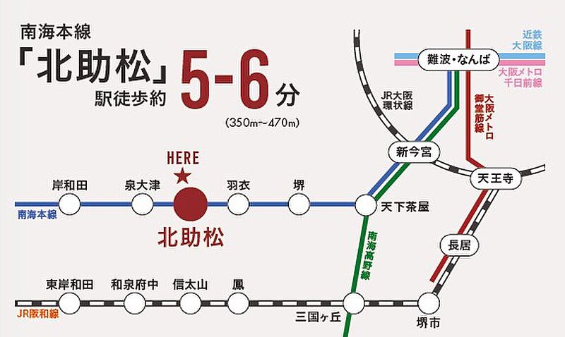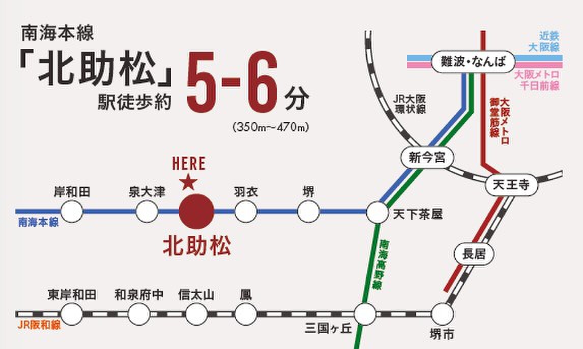 - 南海線「北助松」駅 徒歩5分~6分南海線「松ノ浜」駅 徒歩13分~14分JR阪和線「信太山」駅 徒歩30分~32分
