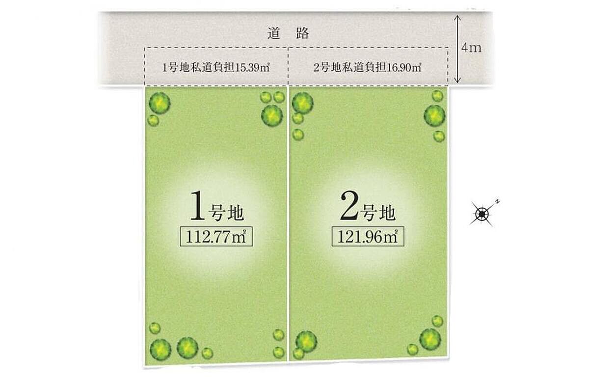| 建物面積 | - | 土地面積 | 112.77m2(34.11坪)・121.96m2(36.89坪) |