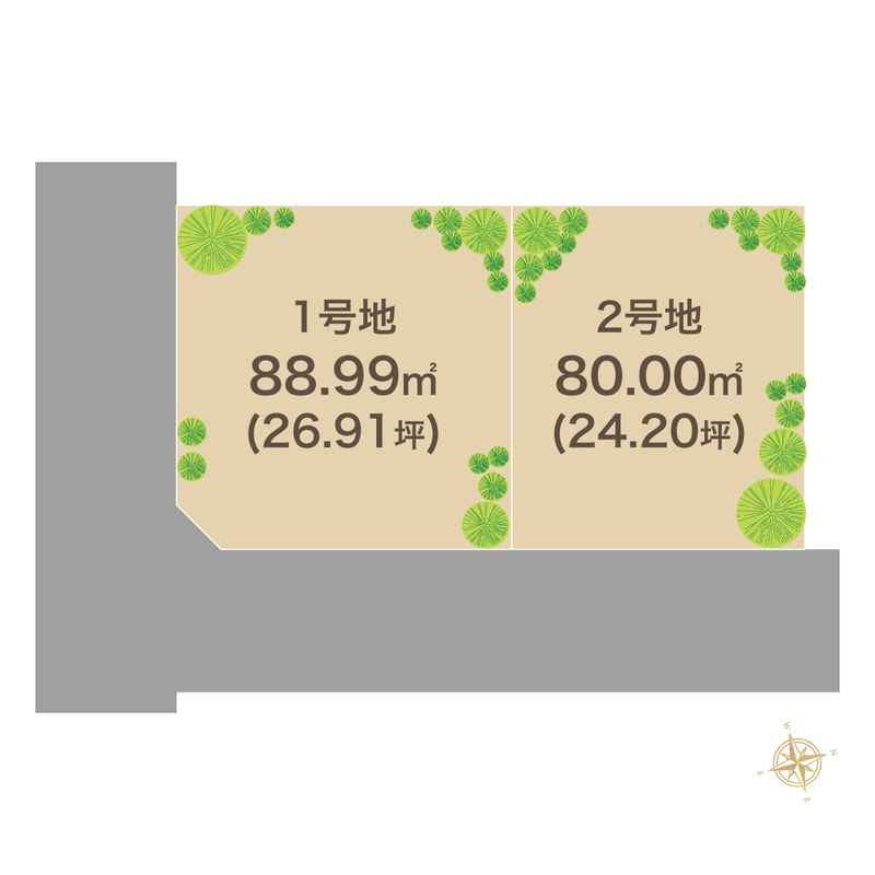 | 建物面積 | - | 土地面積 | 80.00m2・88.99m2(24.20坪・26.91坪) |