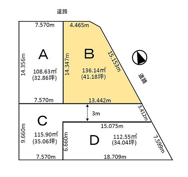 | 建物面積 | - | 土地面積 | A区画:108.63m2 B区画:136.14m2 C区画:115.90m2 D区画:112.55m2 |