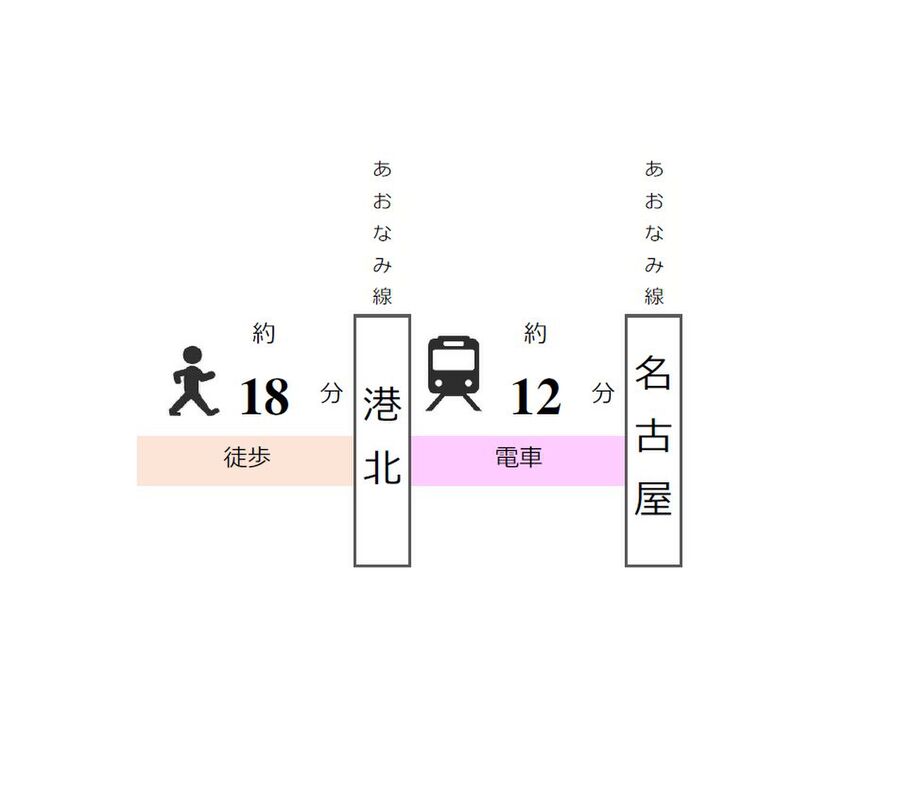名古屋臨海高速あおなみ線「港北」駅 徒歩18分 名古屋臨海高速あおなみ線「荒子川公園」駅 徒歩16分 名古屋市営名港線「港区役所」駅 徒歩23分 |