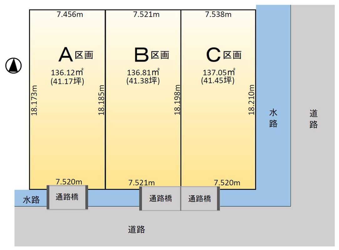 | 建物面積 | - | 土地面積 | A区画:136.12m2 B区画:136.81m2 C区画:137.05m2 |