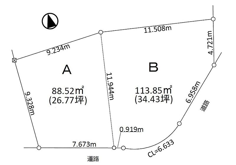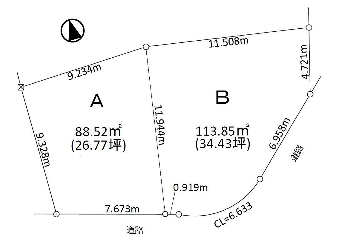 | 建物面積 | - | 土地面積 | A区画:88.52m2 B区画:113.85m2 |