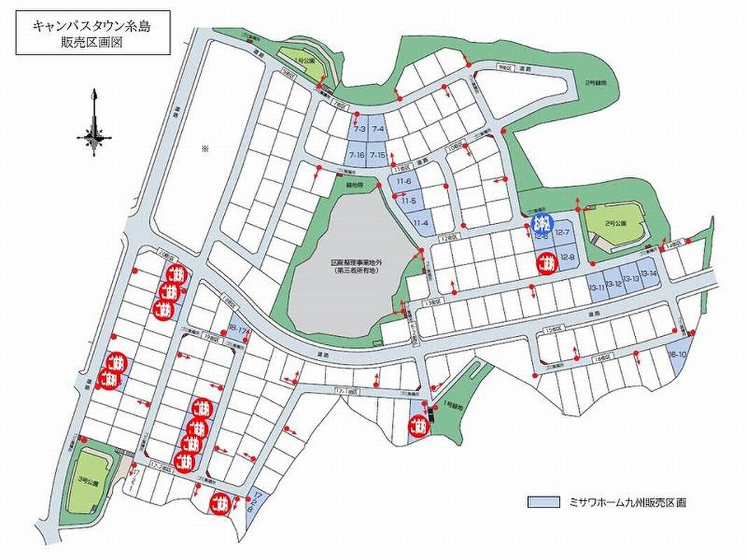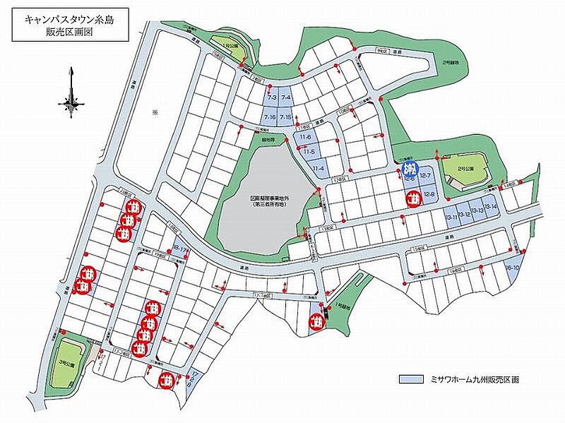 | 備考 | 土地区画整理事業のため、開発ではありません。景観法による規制有、航空法による規制有、敷地面積最低限度有、日影制限有、(1)建物の建築に際し、「エネファーム」の導入が必須となります。(有限会社榊ガス産業)(2)「街並みルール」を定めています。(3)住宅ローンは、福岡銀行の保留地ローンのみが利用可能です。(4)保留地のため換地処分後に所有権移転登記等の登記費用が、別途必要となります。 | ||