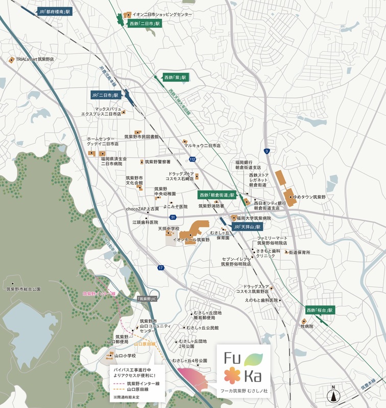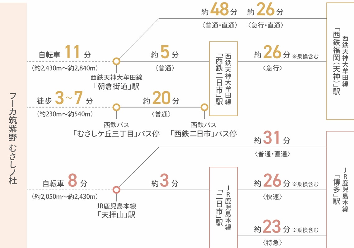 JR鹿児島本線「天拝山」駅 徒歩25分~30分 西鉄バス「むさしヶ丘三丁目」バス停 徒歩3分~7分 |