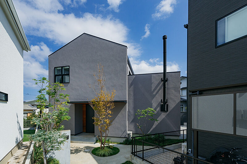 グレーの塗り壁と印象的な煙突が目を引く、上質な外観デザイン。植...
