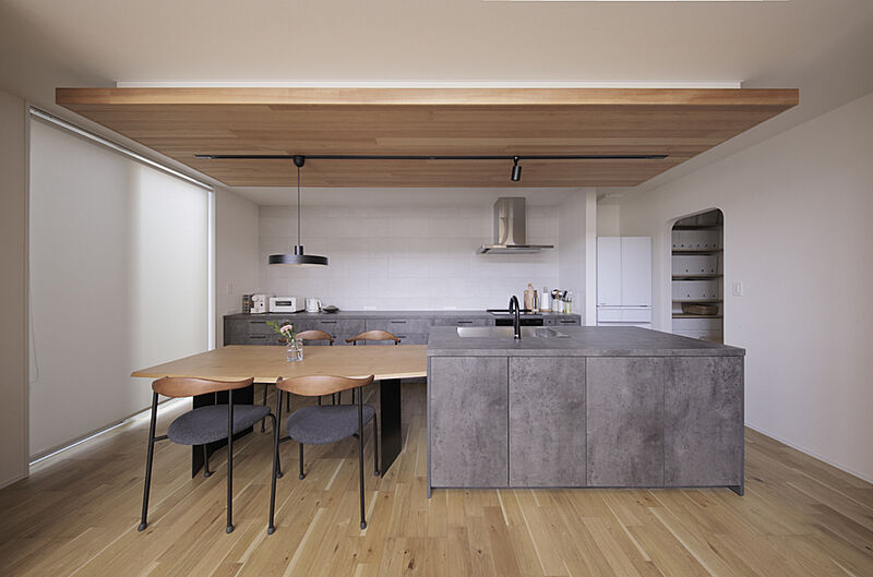 温かみのある木のテーブルと、スタイリッシュなキッチンが調和。食...