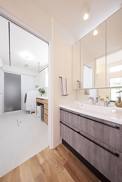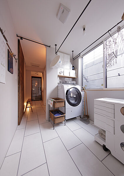 洗面から収納までが一直線につながる効率的な家事動線。明るい空間...