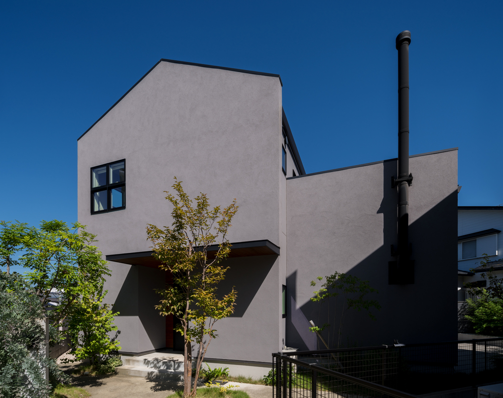 グレーの塗り壁と印象的な煙突が目を引く、上質な外観デザイン。植...