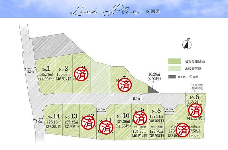 | 備考 | 土砂災害警戒区域(No.6・No.7)、建築基準法第22条区域、景観法、都市再生特別措置法、特定都市河川浸水被害対策法、文化財保護法、藤沢市緑の保全及び緑化の推進に関する条例、盛土規制法●総区画数15区画の内、積水ハウス分は14区画です。●水道負担金/約170,000円(税込)●良好なまちなみの形成を図るため、「まちなみガイドライン」を作成しています。●共有地16.29m2について、14分の1ずつ共有持分として所有いただきます。●道路幅員/4.5m~5.5m●本分譲地の土地売買契約は、契約締結後3ヶ月以内に売主である積水ハウス株式会社との間で建築工事請負契約が成立することを条件として効力を生じます。期限までに、建築工事請負契約が成立しなかったときは、土地売買契約の無効が確定し、受領済の手付金等は、全額無利息にてすみやかに返還いたします。 | ||