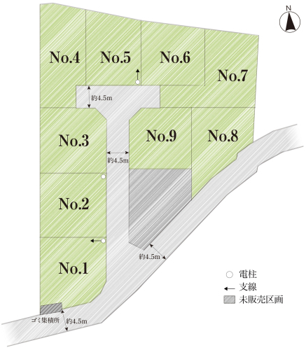 | 開発面積 | 1791.93m2 | 建ぺい率・容積率 | 建ぺい率:60%(No.2・4・5・6・7・8)、70%(No.1・3・9)角地緩和含む/容積率:180 |