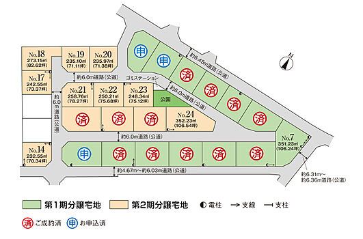 | 備考 | ●その他制限/都市再生特別措置法、宅地造成及び特定盛土等規制法、景観法分譲地内のゴミステーションにつきましては、それぞれ購入した方が27分の1の持分として所有するものとし、本物件の引渡しと同時に所有権移転登記をするものとする。●水道負担金(20mm)/79,000円(税込)※手付金保全機関/西日本住宅産業信用(株)※本分譲地におきましては、良好な低層住宅地の形成と住環境の向上を図る目的で「まちなみガイドライン」を設けております。詳しい内容につきましては係員にお尋ねください。※坪表示は1m2=0.3025坪で換算し、小数点第3位以下は切り捨てとしました。※施設までの徒歩時間については1分=80mで計算しています。※車での分数は、実際の走行時間となります。※各施設までの距離は区画No.7、No.14、No.20を基点としております。●本分譲地の土地売買契約は、契約締結後3ヶ月以内に売主である積水ハウス株式会社との間で建築工事請負契約が成立することを条件として効力を生じます。期限までに、建築工事請負契約が成立しなかったときは、土地売買契約の無効が確定し、受領済の手付金等は、全額無利息にてすみやかに返還いたします。 | ||