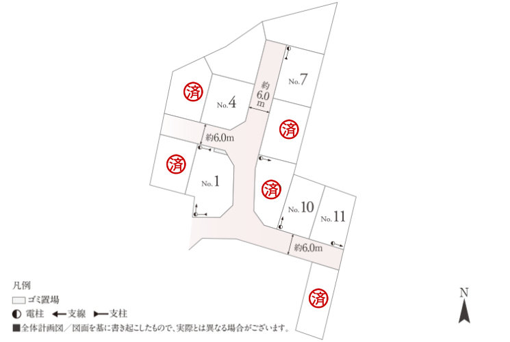| 主たる設備の概要 | 東京電力、都市ガス、公営水道、汚水:公共下水、雨水:浸透式 ゴミステーション(ゴミステーションは、各々1/12ずつ共有して頂きます) | 開発許可番号 | 完成済(No.1、No.4、No.7、No.10、No.11) |