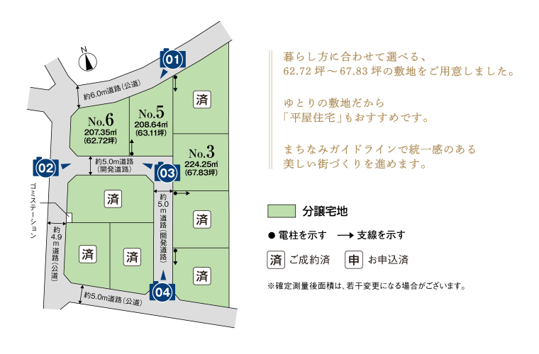 | 備考 | 景観法、都市再生特別措置法●道路の幅員及び舗装/南5m(市道)・南5m(開発道路)アスファルト舗装・西4.9m(市道)・西5m(開発道路)アスファルト舗装・北6m(市道)●手付金等保全機関:西日本住宅産業信用保証(株)●坪表示は、1m2=0.3025坪で換算し、小数第3位以下切り捨てとしました。●良好な住環境を保つため「コモンステージ古河市上辺見まちなみガイドライン」がございます。●先着順の為、売約済の場合がございます。予めご了承ください。●宅建業法33条に規定する許可等の処分の番号/古建指令第229号 許可番号第58号●本分譲地の土地売買契約は、契約締結後3ヶ月以内に売主である積水ハウス株式会社との間で建築工事請負契約が成立することを条件として効力を生じます。期限までに、建築工事請負契約が成立しなかったときは、土地売買契約の無効が確定し、受領済の手付金等は、全額無利息にてすみやかに返還いたします。 | ||