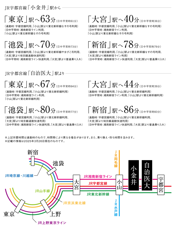 JR東北本線「小金井」駅 徒歩17分 JR東北本線「自治医大」駅 徒歩24分 |