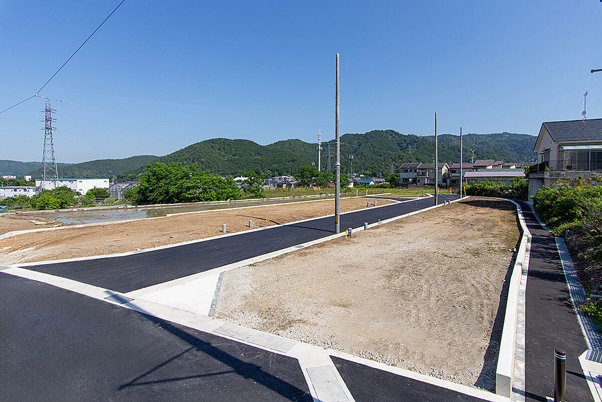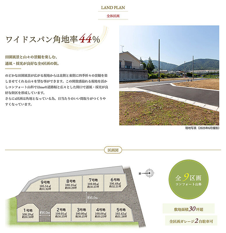 自由設計対応、ワイドスパン、角地率44%。周辺には田園風景が広がる全9区画の街。6mの道路幅と広々とした間口(4区画は角地)で通風・採光が良好な思い描いた理想の住まいを実現可能。