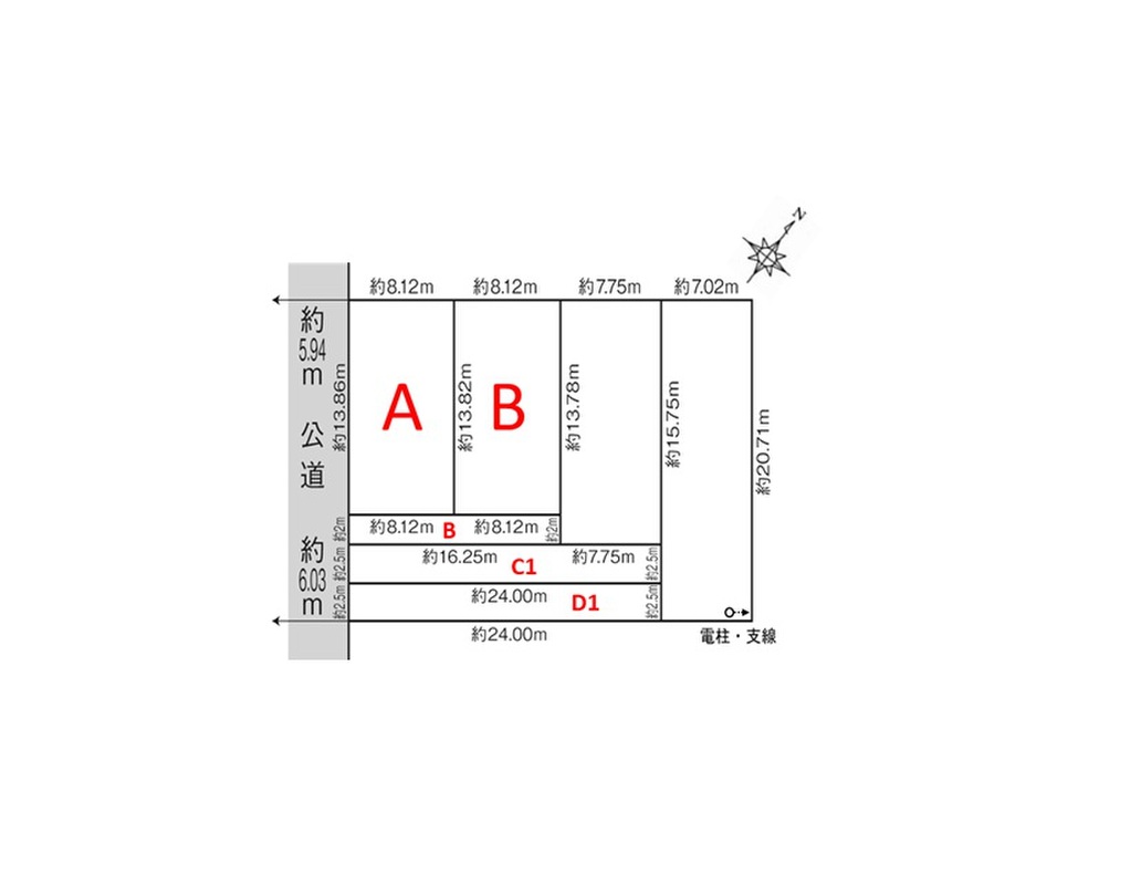 【制限事項】 法22条区域 ※第一種高度地区(絶対高さ18m) ※上下水道公道工事負担金(1,485,000円税込/1宅)+市納金(132,000円税込20mm)+下水道受益者負担金(390円/m2×敷地面積)が必要となります。。 ※B1,C1,D1区画上空にはA,B,C各区画住宅への引込線が設置されます。 ※B1,C1,D1は4区画それぞれの通行地役権設定を行う事とその費用が発生します。 ※地目変更要 |