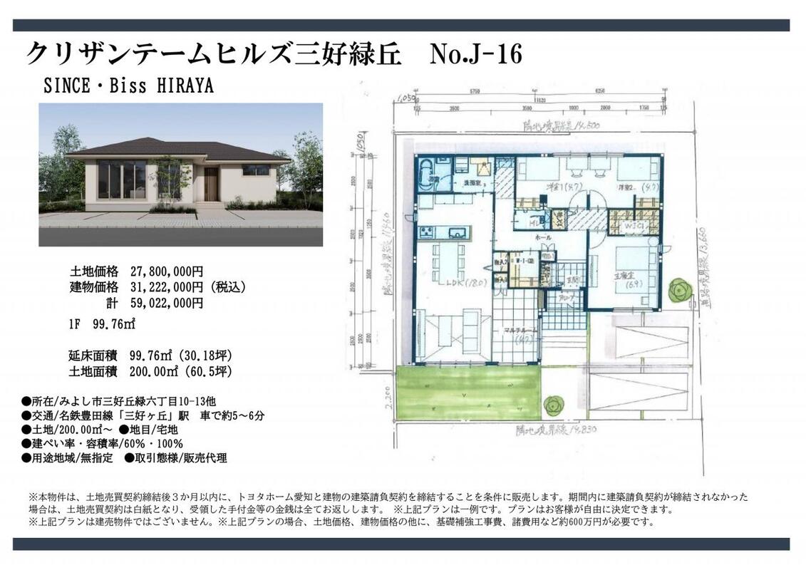 【引渡】現況 【制限事項】 景観法 砂防法 特定都市河川浸水被害対策法 道路斜線制限 隣地斜線制限 日影規制 ※まちづくりガイドライン有り ※水道加入分担金:110,000円(税込20ミリ) ※工事検査料:1000円(非課税) ※壁面後退有り:1m以上 この土地は土地売買契約後3ヶ月以内にトヨタホーム愛知(株)と建物の建築請負契約を締結することを条件に販売します。この期間内に建築請負契約が締結されなかった場合は、土地売買契約は白紙となり受領した手付金等の土地代金は全てお返しいたします。 |