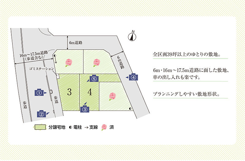 【物件ポイント】区画整理地内できれいな街並みにある全5区画の分譲地です。全区画39坪超、プランニングがしやすい敷地形状になっています。浸水する可能性が低いエリアです。