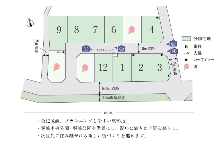 | 駐車場 | - | 道路の幅員 | 道路幅:2.9m~6m/道路幅の備考:東側:4.54m、分譲地内:5.0m、西側:2.91m(未舗装)、南側:9.68m(3.6m緑道部分含む、石敷) |