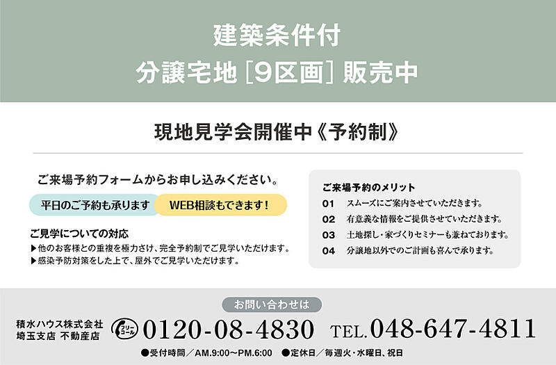 | 備考 | その他制限等/景観誘導区域、宅地造成及び特定盛土等規制法●水道分担金(110,000円・税込)および検査手数料(7,800円)が別途必要です。●道路の幅員及び舗装/西側:2.91m、東側:4.54m、南側:(水路幅員を含み)9.68mとみなす、開発による道路:5.0mアスファルト舗装(3.6m緑道部分、石敷)●私道負担/なし※ゴミステーション(3.73m2)は各購入者様にて1区画あたり1/12の持分を持っていただきます。●その他制限等/準防火地域●良好な住環境を保つために「まちなみガイドライン」がございます。※先着順販売の為、売約済みの場合がございます。予めご容赦ください。※坪表示は1m2=0.3025坪で換算し、小数点第3位以下は切り捨てとしました。※徒歩分数は80m/1分で算出(1分未満は切り上げております)、自転車・車の所要時間は実走の場合です。※先着順販売の為、売約済みの場合がございます。予めご容赦ください。●本分譲地の土地売買契約は、契約締結後3ヶ月以内に売主である積水ハウス株式会社との間で建築工事請負契約が成立することを条件として効力を生じます。期限までに、建築工事請負契約が成立しなかったときは、土地売買契約の無効が確定し、受領済の手付金等は、全額無利息にてすみやかに返還いたします。 | ||